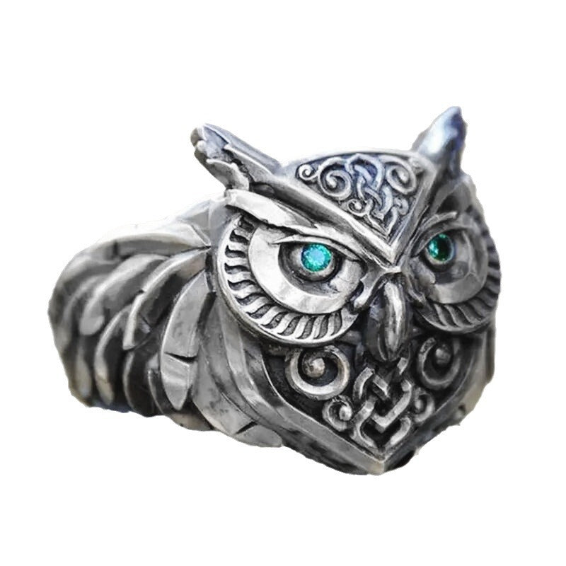 Design: Detailed owl motif with engraved feathers and glowing eyes
