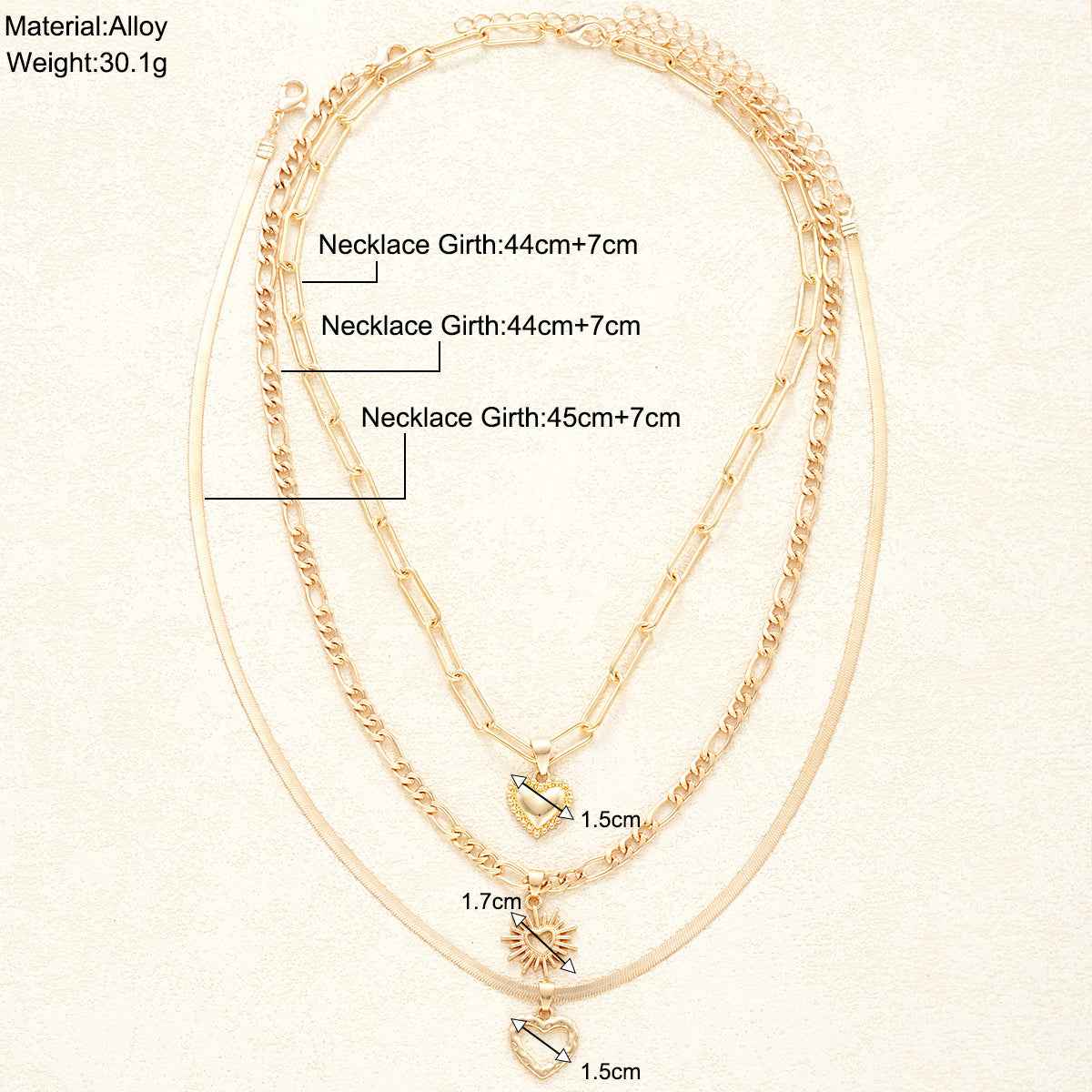 The design is accentuated with delicate heart-inspired charms, including a radiant sunburst heart, a minimal hollow heart, and a textured statement heart pendant, each adding depth and character to the overall aesthetic. The layered construction sits gracefully on the neckline, offering a refined, fashion-forward appeal inspired by contemporary Korean jewellery trends.
